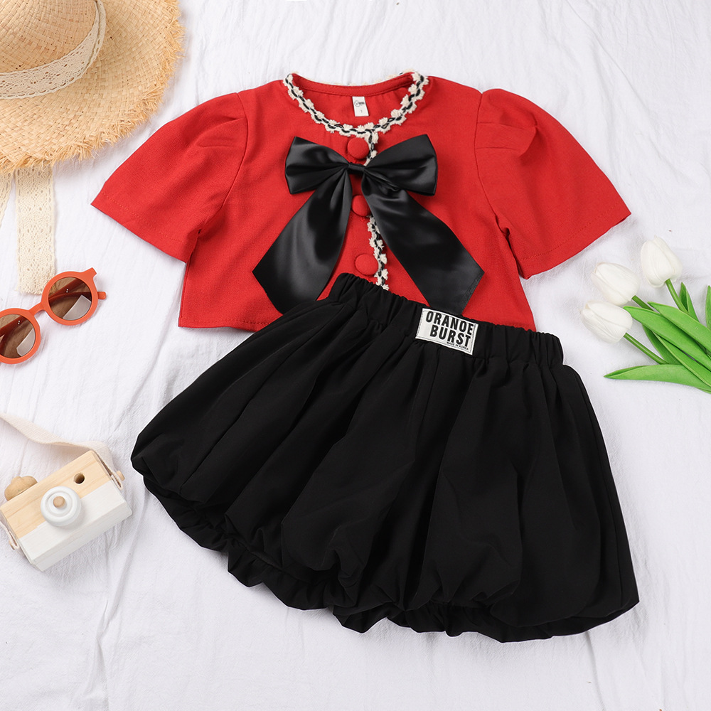 18M-6Y Wave Print Short Sleeve Big Bowknot Button Tops And Black Skirt Set Wholesale Kids Boutique Clothing Wholesale