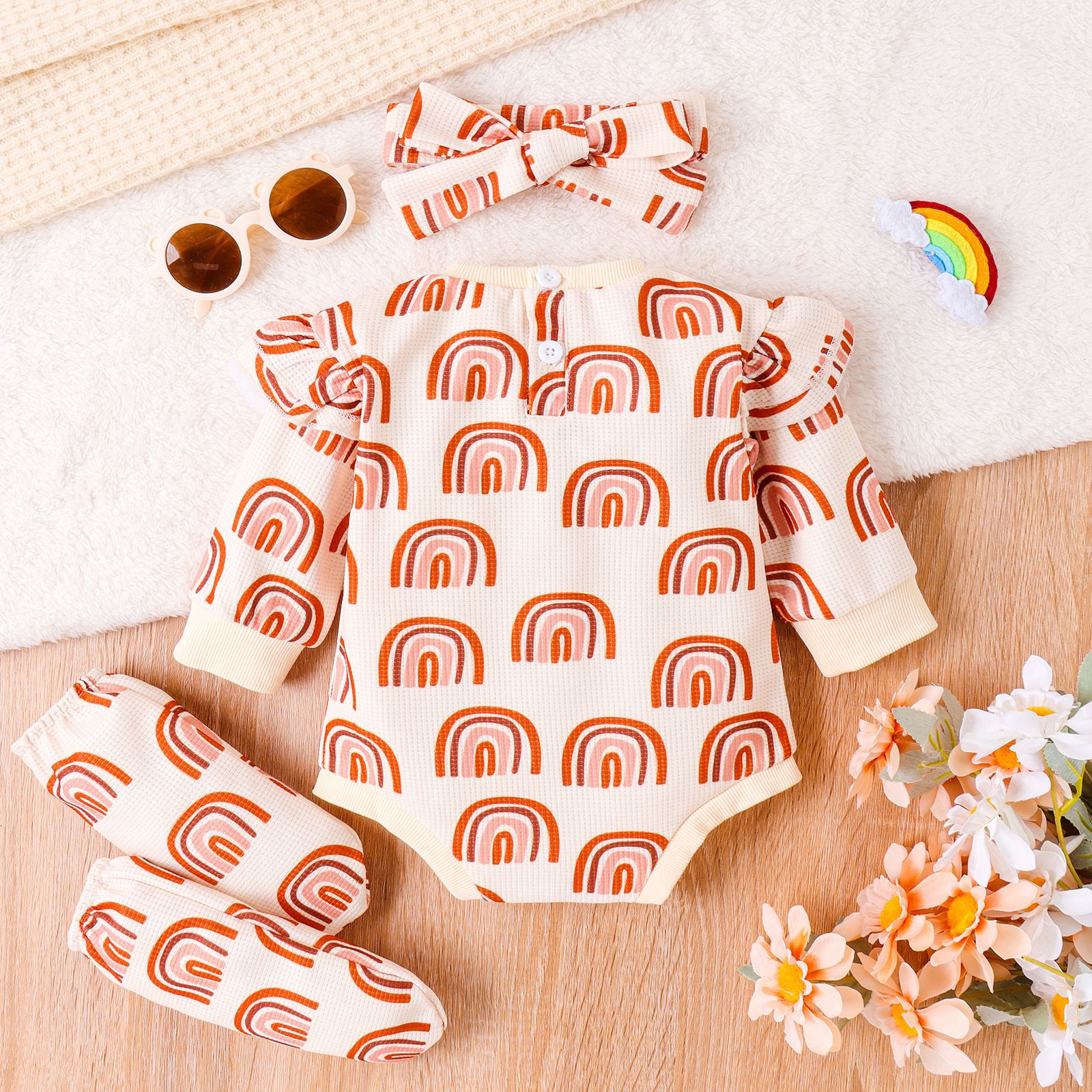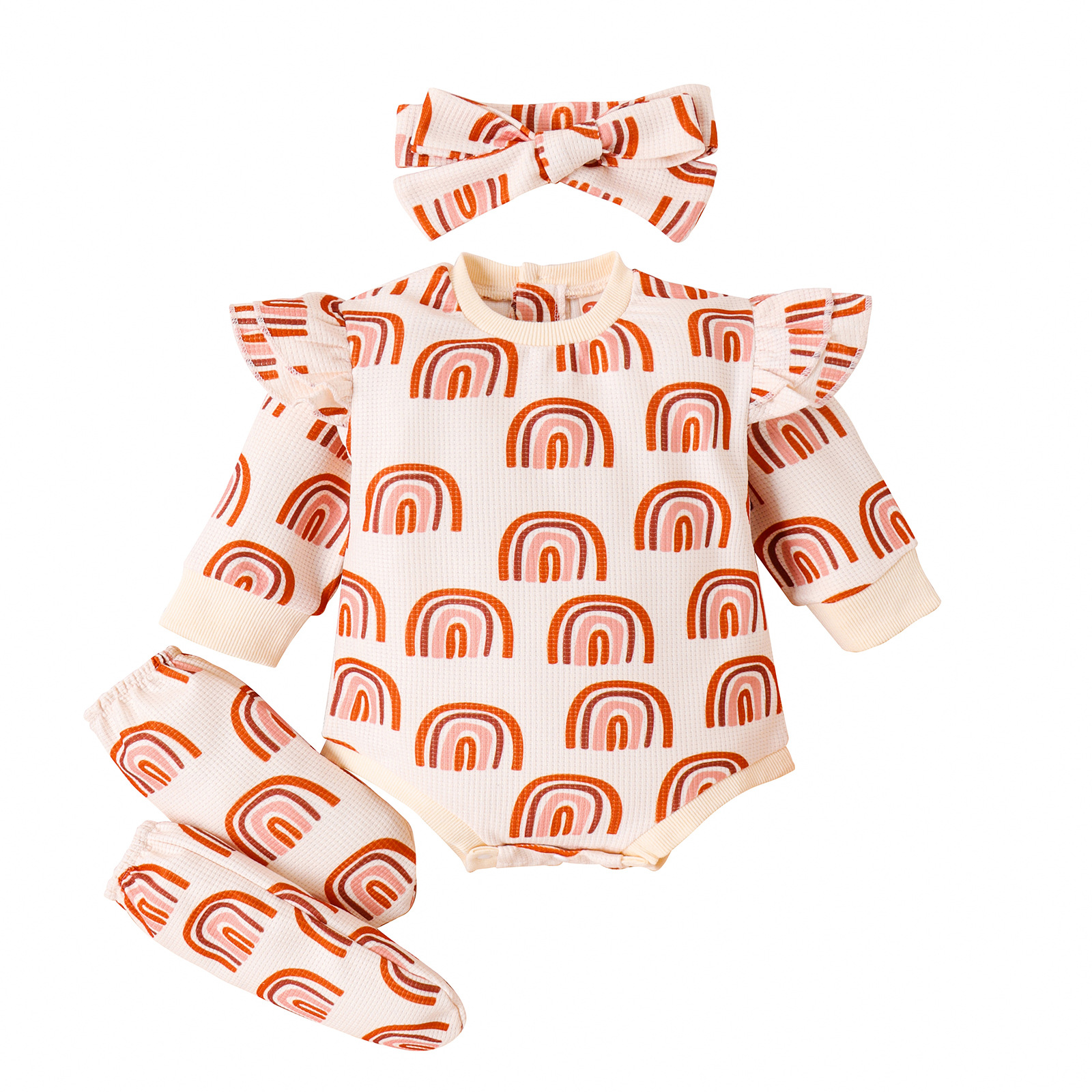 3-24M Baby Waffle Rainbow Print Bodysuit & Headband & Footwear Three-Piece Set Wholesale Baby Clothing Wholesale