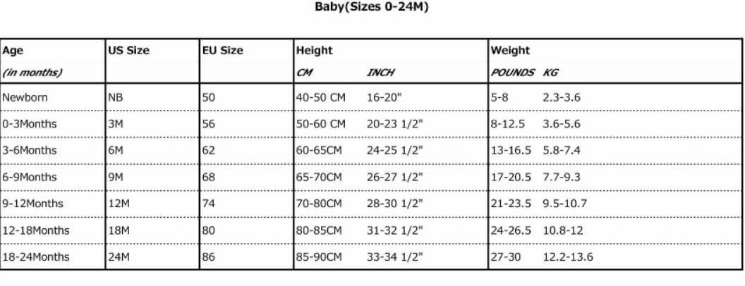 Buying clothes for your baby is a happy thing for parents. But the reality is that many retailers do not provide baby clothes size charts, so even if parents are faced with many beautiful baby clothes, they cannot decide to buy them immediately. The following is the Kiskissing size chart of the baby of different ages. No matter how old your baby is, you can find the sizes-age-weight-height info here.